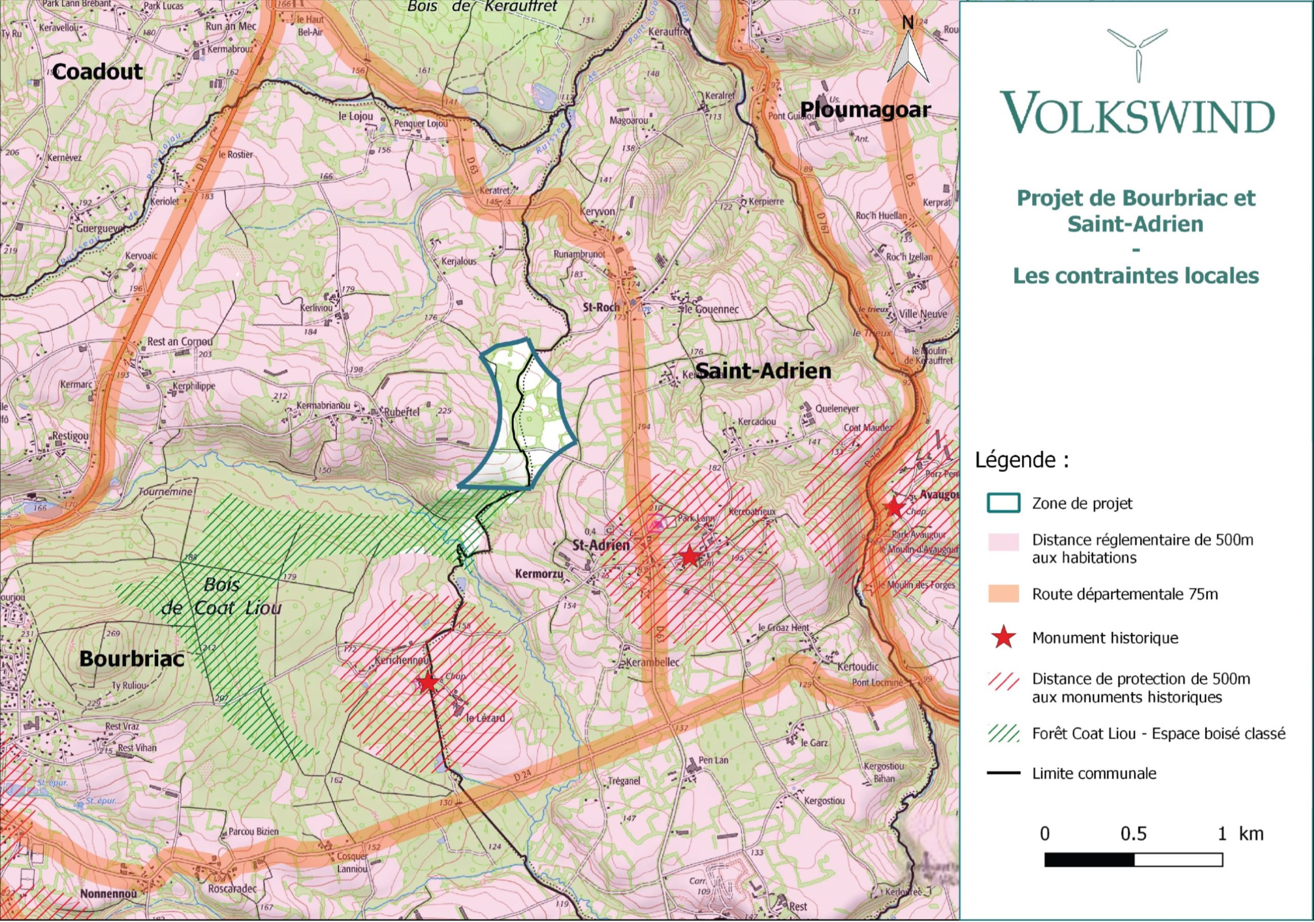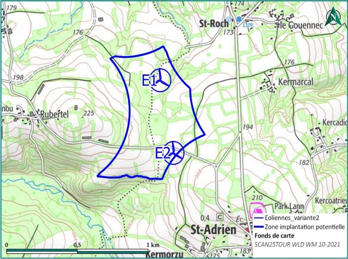 Situé principalement sur la commune de Saint Adrien (Côtes d’Armor-22) et sur la commune de Bourbriac pour quelques aménagements, le projet éolien du Bourdrien est situé au sud de Guigamp.
